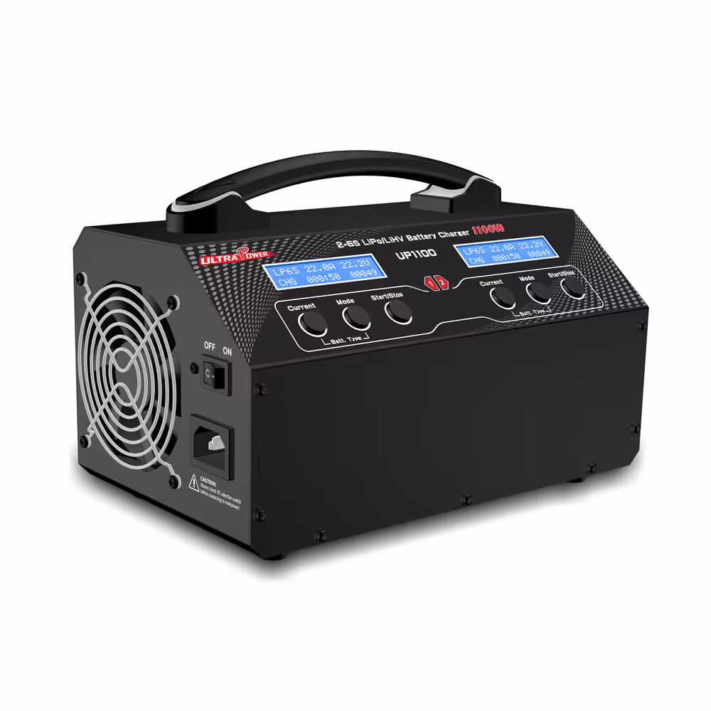 The Ultra Power UP1100 is a high‑efficiency dual‑channel intelligent charger designed for 2–6S LiPo and LiHV batteries used in RC models, UAVs, and industrial applications. With 550W × 2 channels and up to 22A per channel, it delivers fast, stable, and accurate charging for medium‑to‑large capacity battery packs.
