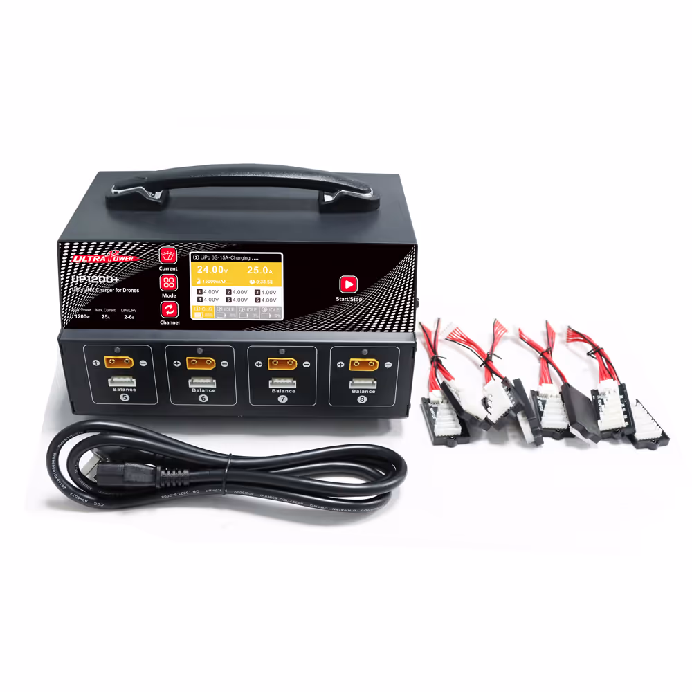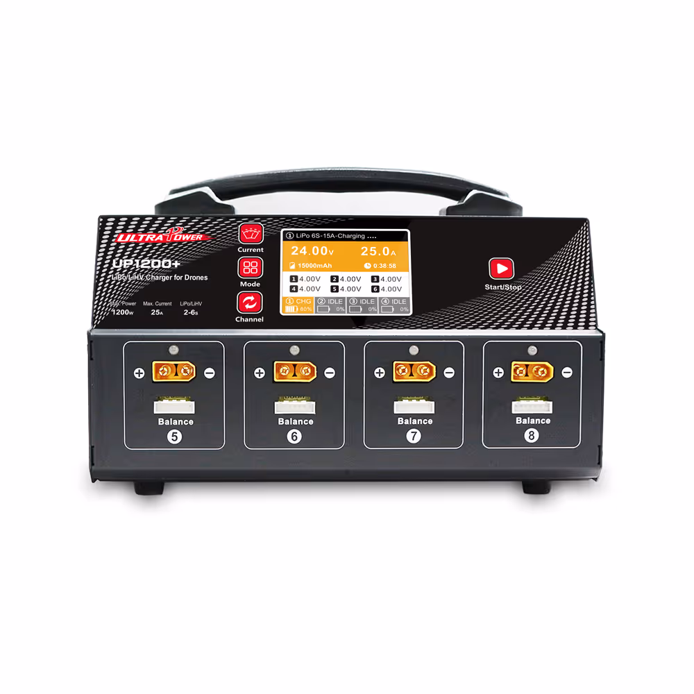 The Ultra Power UP1200+ is a high‑capacity, multi‑channel intelligent charger engineered for professional UAV operations, agricultural drones, and industrial battery systems. With 8 independent channels, 1200W total output, and up to 25A per channel, it enables fast, efficient, and safe charging for 2–6S LiPo and LiHV battery packs.
